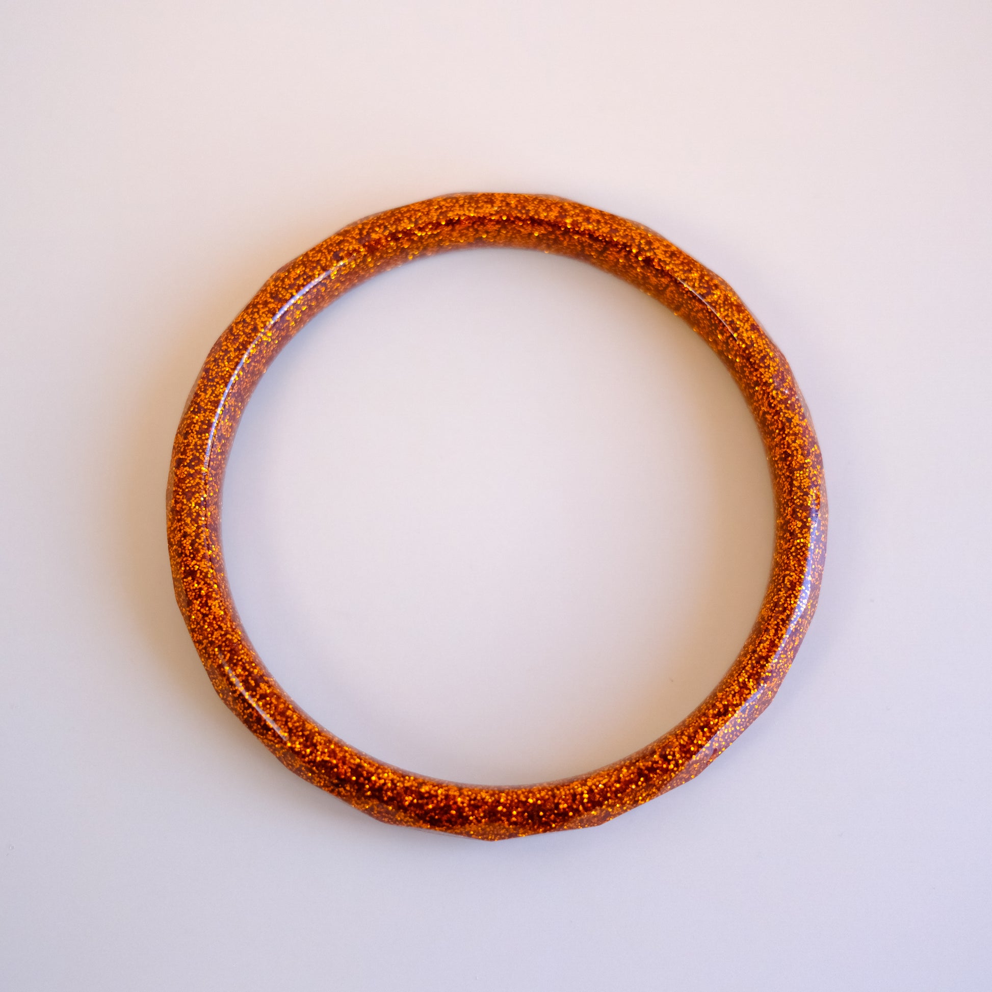 Ce bracelet jonc en résine est une véritable pièce lumineuse qui capte la lumière à chaque mouvement. Son mélange subtil de pailettes cuivre crée un effet profond et raffiné, à la fois moderne et féminin.